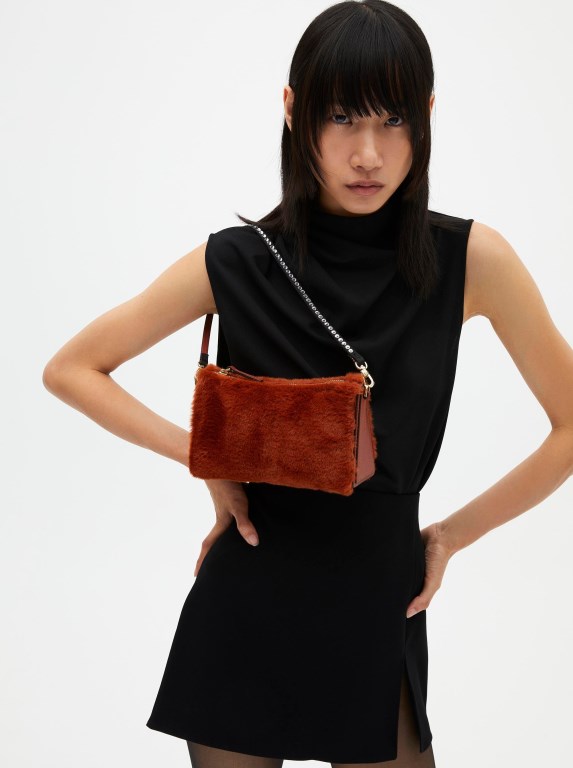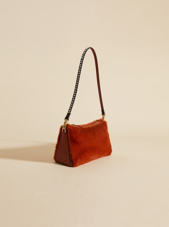 Elevate your style with the Red Bole & Black Faux Fur Mini Prism Bag, a bold and chic accessory for a standout look.